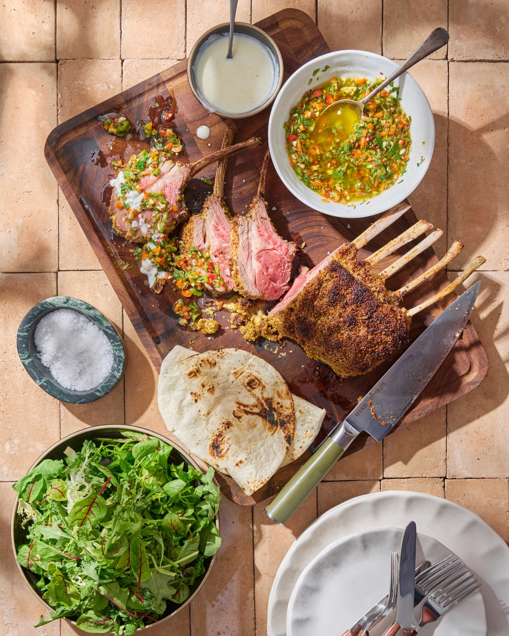 Slice the lamb and arrange on a platter with the roasted vegetables. Serve with salad greens, flatbread, yoghurt sauce, and a drizzle of spicy mint oil.